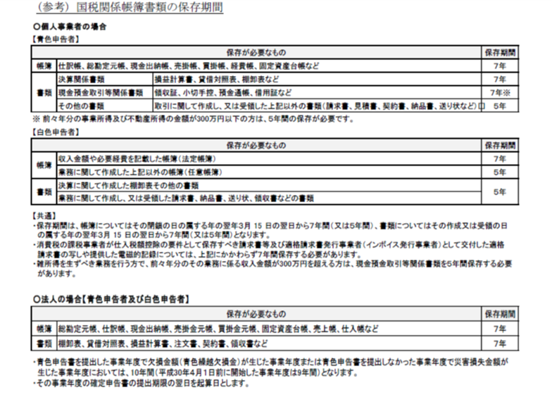 個人は青色申告者と白色申告者で少し異なります。青色申告者の場合、帳簿と決算関係書類は7年間、現金預金取引関係書類も7年間です。ただし、前々年の事業所得と不動産所得の合計が300万円以下なら5年間で大丈夫です。